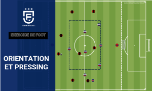Aujourd’hui nous allons travailler l’orientation pour avantager notre récupération. Dans cet exercice nous allons chercher à amener l’adversaire à jouer dans la densité plein axe de manière à ce qu’il se retrouve sous pression privé de temps et d’espace pour évoluer… Et dans un second temps, anticiper une transition offensive efficace en profitant de l’élargissement des intervalles chez l’équipe adverse.