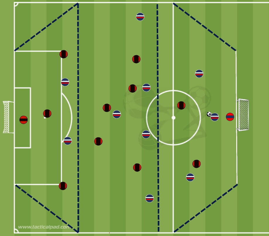 - Placer trois joueurs de chaque équipe dans le tiers défensif, cinq dans le tiers intermédiaire et deux dans le tiers offensif.